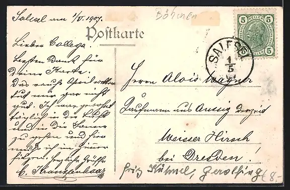 alte Ansichtskarte, gelaufen 1907, Stempelspur, guter Zustand