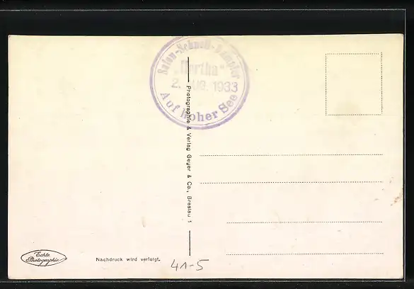 Personenbezogene Daten auf der Rückseite der Karte wurden durch blauen Textmarker unkenntlich gemacht. Die blauen Stellen sind auf die Vorderseite durchgeweicht und wirken sich negativ auf das Postkartenfoto aus