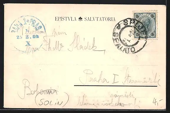 Personenbezogene Daten auf der Rückseite der Karte wurden durch blauen Textmarker unkenntlich gemacht. Die blauen Stellen sind auf die Vorderseite durchgeweicht und wirken sich negativ auf das Postkartenfoto aus