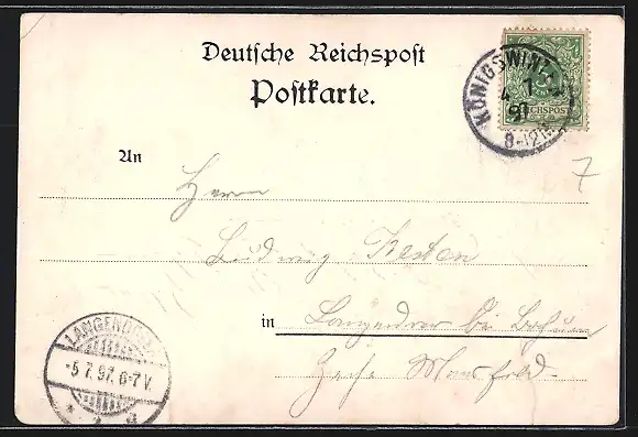 alte Ansichtskarte, gelaufen 1897, Eckknick re. oben, Einriss unten li.