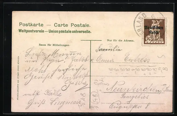 Personenbezogene Daten auf der Rückseite der Karte wurden durch blauen Textmarker unkenntlich gemacht. Die blauen Stellen sind auf die Vorderseite durchgeweicht und wirken sich negativ auf das Postkartenfoto aus