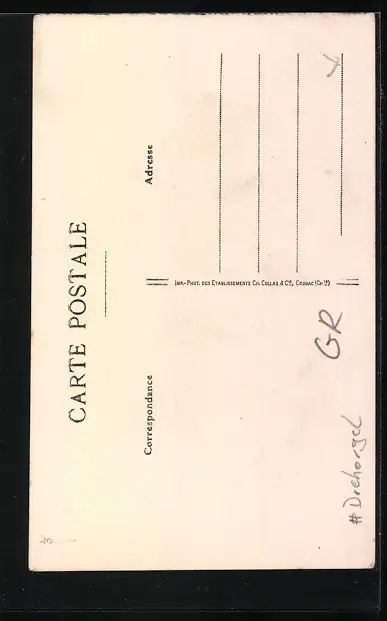 Personenbezogene Daten auf der Rückseite der Karte wurden durch blauen Textmarker unkenntlich gemacht. Die blauen Stellen sind auf die Vorderseite durchgeweicht und wirken sich negativ auf das Postkartenfoto aus