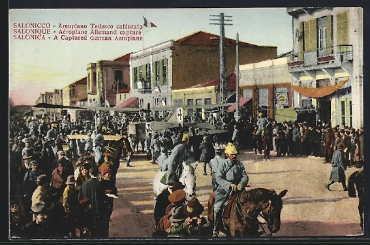 AK Salonique, Albatros conduit au parc, Transport von erobertem deutschem Kampfflugzeug, 1. Weltkrieg, Doppeldecker