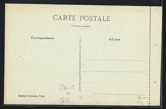 Personenbezogene Daten auf der Rückseite der Karte wurden durch blauen Textmarker unkenntlich gemacht. Die blauen Stellen sind auf die Vorderseite durchgeweicht und wirken sich negativ auf das Postkartenfoto aus