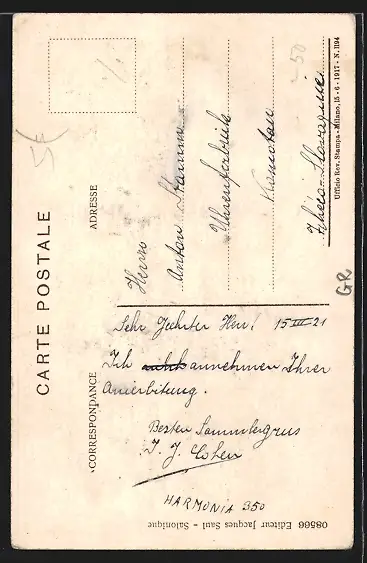 Personenbezogene Daten auf der Rückseite der Karte wurden durch blauen Textmarker unkenntlich gemacht. Die blauen Stellen sind auf die Vorderseite durchgeweicht und wirken sich negativ auf das Postkartenfoto aus