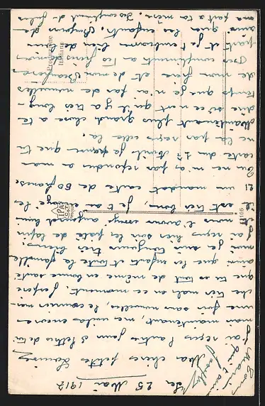 Personenbezogene Daten auf der Rückseite der Karte wurden durch blauen Textmarker unkenntlich gemacht. Die blauen Stellen sind auf die Vorderseite durchgeweicht und wirken sich negativ auf das Postkartenfoto aus