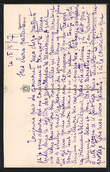 Personenbezogene Daten auf der Rückseite der Karte wurden durch blauen Textmarker unkenntlich gemacht. Die blauen Stellen sind auf die Vorderseite durchgeweicht und wirken sich negativ auf das Postkartenfoto aus