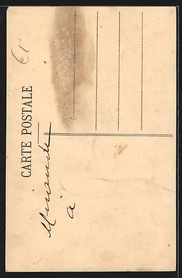 Personenbezogene Daten auf der Rückseite der Karte wurden durch blauen Textmarker unkenntlich gemacht. Die blauen Stellen sind auf die Vorderseite durchgeweicht und wirken sich negativ auf das Postkartenfoto aus