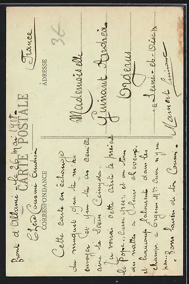 Personenbezogene Daten auf der Rückseite der Karte wurden durch blauen Textmarker unkenntlich gemacht. Die blauen Stellen sind auf die Vorderseite durchgeweicht und wirken sich negativ auf das Postkartenfoto aus
