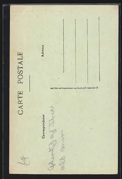 Personenbezogene Daten auf der Rückseite der Karte wurden durch blauen Textmarker unkenntlich gemacht. Die blauen Stellen sind auf die Vorderseite durchgeweicht und wirken sich negativ auf das Postkartenfoto aus