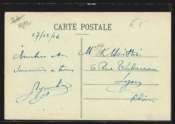 Personenbezogene Daten auf der Rückseite der Karte wurden durch blauen Textmarker unkenntlich gemacht. Die blauen Stellen sind auf die Vorderseite durchgeweicht und wirken sich negativ auf das Postkartenfoto aus