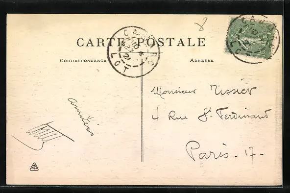 Personenbezogene Daten auf der Rückseite der Karte wurden durch blauen Textmarker unkenntlich gemacht. Die blauen Stellen sind auf die Vorderseite durchgeweicht und wirken sich negativ auf das Postkartenfoto aus