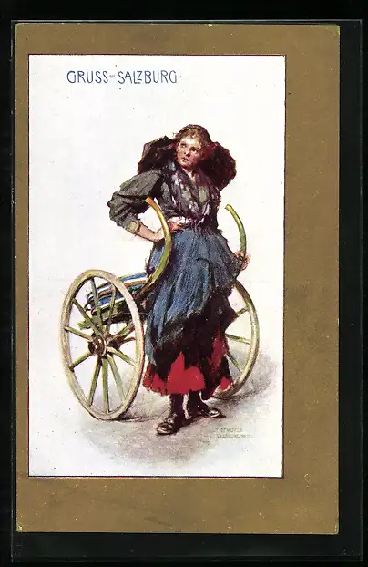 AK Salzburg, Frau in Tracht zieht einen Wagen