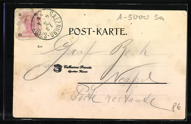 Personenbezogene Daten auf der Rückseite der Karte wurden durch blauen Textmarker unkenntlich gemacht. Die blauen Stellen sind auf die Vorderseite durchgeweicht und wirken sich negativ auf das Postkartenfoto aus