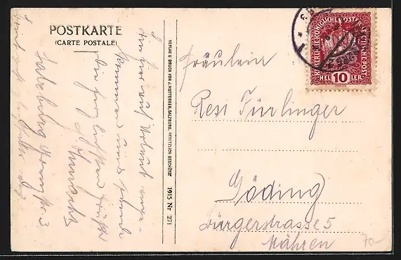 Personenbezogene Daten auf der Rückseite der Karte wurden durch blauen Textmarker unkenntlich gemacht. Die blauen Stellen sind auf die Vorderseite durchgeweicht und wirken sich negativ auf das Postkartenfoto aus