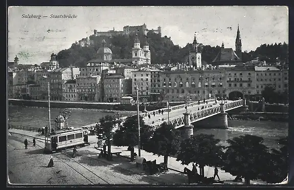 AK Salzburg, Strassenbahn vor der Staatsbrücke