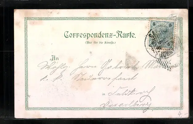 Personenbezogene Daten auf der Rückseite der Karte wurden durch blauen Textmarker unkenntlich gemacht. Die blauen Stellen sind auf die Vorderseite durchgeweicht und wirken sich negativ auf das Postkartenfoto aus