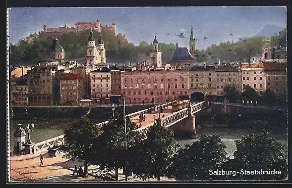 AK Salzburg, Teilansicht mit Strassenbahn auf der Staatsbrücke
