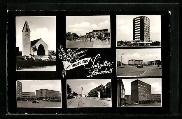 AK Salzgitter-Lebenstedt, Hochhäuser, Kirche, Strassenpartie mit Passanten