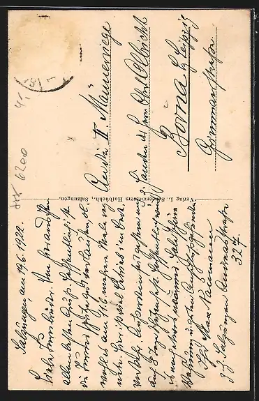 Personenbezogene Daten auf der Rückseite der Karte wurden durch blauen Textmarker unkenntlich gemacht. Die blauen Stellen sind auf die Vorderseite durchgeweicht und wirken sich negativ auf das Postkartenfoto aus