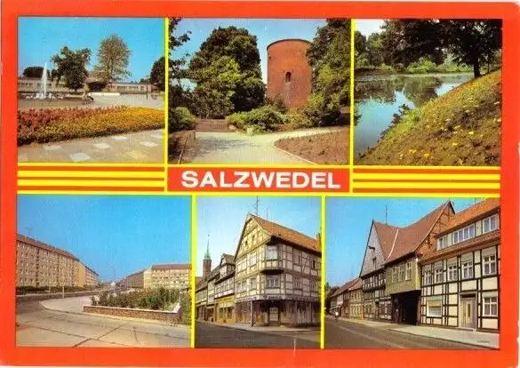 Ansichtskarte Salzwedel 6 Abb., Klubhaus der Erdgasarbeiter, Burggarten, Am Pfefferteich, Ernst-Thälmann-Straße, Burgstraße, Straße der Jugend Erhaltung II, Beförderungsspuren postalisch gelaufen, gestempelt: Stendal 2, 28.06.88 Druckvermerk: 1981 Herstellungsland: DDR Verlag: Bild und Heimat Reichenbach - 01 07 0128