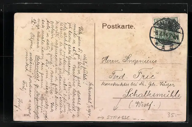Personenbezogene Daten auf der Rückseite der Karte wurden durch blauen Textmarker unkenntlich gemacht. Die blauen Stellen sind auf die Vorderseite durchgeweicht und wirken sich negativ auf das Postkartenfoto aus
