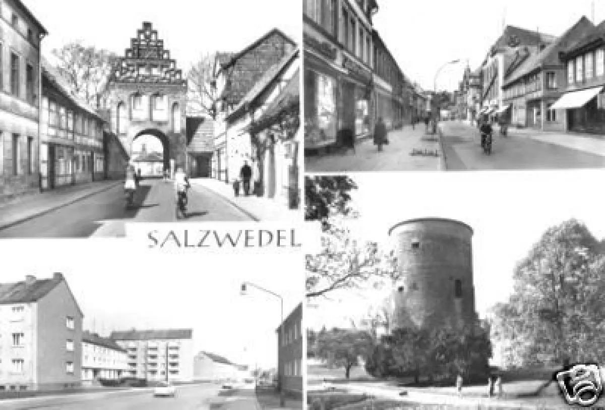 Ansichtskarte Salzwedel vier Abb. - Steintor, Wilhelm-Dieckmann-Str., Str. der Freundschaft, Burggarten Erhaltung I-II ungelaufen Druckvermerk: 1975 Herstellungsland: DDR Verlag: Planet-Verlag Berlin - 03 07 13 011M