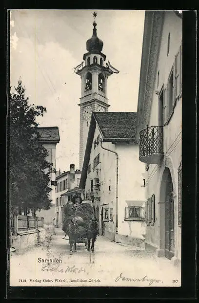 AK Samaden, Strassenpartie mit Turm und Pferdewagen