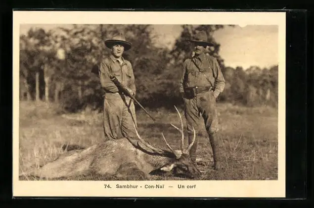 AK Sambhur-Con-Nai, Un cerf, Zwei Jäger mit einem erlegten Hirsch