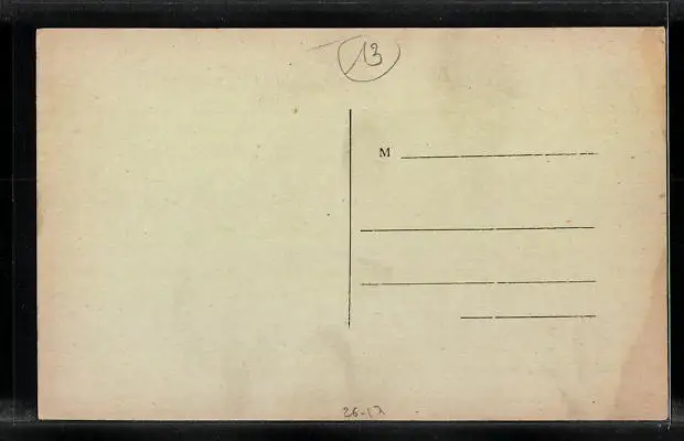 Personenbezogene Daten auf der Rückseite der Karte wurden durch blauen Textmarker unkenntlich gemacht. Die blauen Stellen sind auf die Vorderseite durchgeweicht und wirken sich negativ auf das Postkartenfoto aus