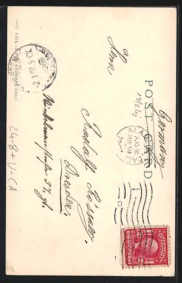 Personenbezogene Daten auf der Rückseite der Karte wurden durch blauen Textmarker unkenntlich gemacht. Die blauen Stellen sind auf die Vorderseite durchgeweicht und wirken sich negativ auf das Postkartenfoto aus