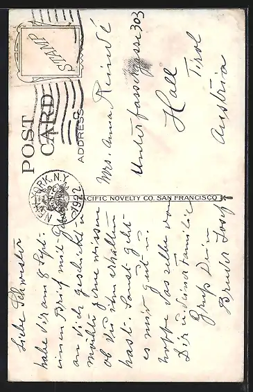 Personenbezogene Daten auf der Rückseite der Karte wurden durch blauen Textmarker unkenntlich gemacht. Die blauen Stellen sind auf die Vorderseite durchgeweicht und wirken sich negativ auf das Postkartenfoto aus