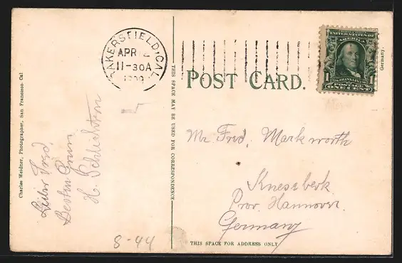 Personenbezogene Daten auf der Rückseite der Karte wurden durch blauen Textmarker unkenntlich gemacht. Die blauen Stellen sind auf die Vorderseite durchgeweicht und wirken sich negativ auf das Postkartenfoto aus