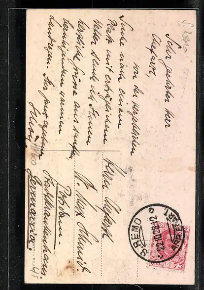 Personenbezogene Daten auf der Rückseite der Karte wurden durch blauen Textmarker unkenntlich gemacht. Die blauen Stellen sind auf die Vorderseite durchgeweicht und wirken sich negativ auf das Postkartenfoto aus