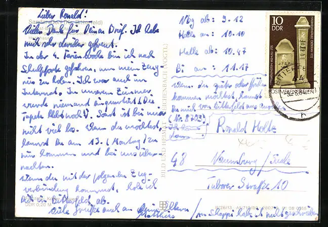 Personenbezogene Daten auf der Rückseite der Karte wurden durch blauen Textmarker unkenntlich gemacht. Die blauen Stellen sind auf die Vorderseite durchgeweicht und wirken sich negativ auf das Postkartenfoto aus