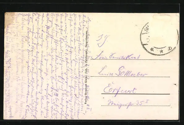 Personenbezogene Daten auf der Rückseite der Karte wurden durch blauen Textmarker unkenntlich gemacht. Die blauen Stellen sind auf die Vorderseite durchgeweicht und wirken sich negativ auf das Postkartenfoto aus