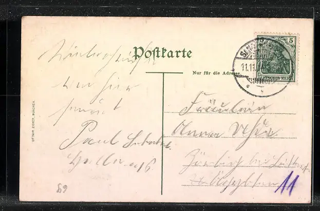 Personenbezogene Daten auf der Rückseite der Karte wurden durch blauen Textmarker unkenntlich gemacht. Die blauen Stellen sind auf die Vorderseite durchgeweicht und wirken sich negativ auf das Postkartenfoto aus