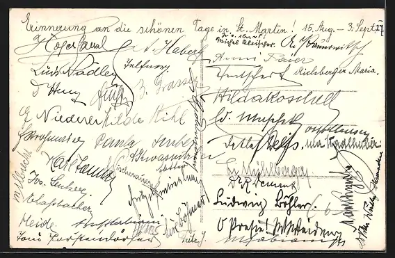 Personenbezogene Daten auf der Rückseite der Karte wurden durch blauen Textmarker unkenntlich gemacht. Die blauen Stellen sind auf die Vorderseite durchgeweicht und wirken sich negativ auf das Postkartenfoto aus