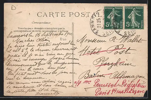 Personenbezogene Daten auf der Rückseite der Karte wurden durch blauen Textmarker unkenntlich gemacht. Die blauen Stellen sind auf die Vorderseite durchgeweicht und wirken sich negativ auf das Postkartenfoto aus