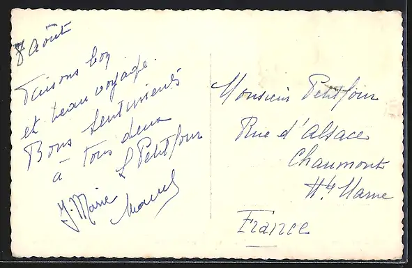Personenbezogene Daten auf der Rückseite der Karte wurden durch blauen Textmarker unkenntlich gemacht. Die blauen Stellen sind auf die Vorderseite durchgeweicht und wirken sich negativ auf das Postkartenfoto aus