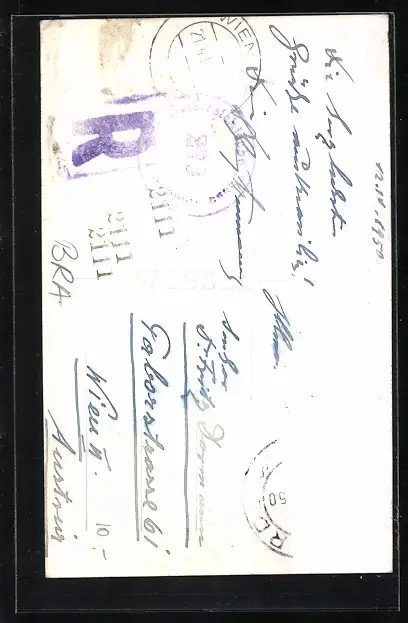 Personenbezogene Daten auf der Rückseite der Karte wurden durch blauen Textmarker unkenntlich gemacht. Die blauen Stellen sind auf die Vorderseite durchgeweicht und wirken sich negativ auf das Postkartenfoto aus