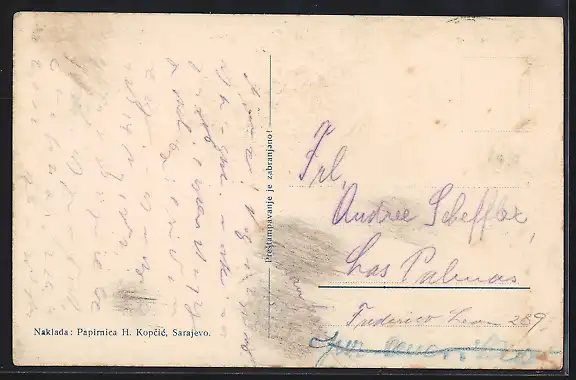 Personenbezogene Daten auf der Rückseite der Karte wurden durch blauen Textmarker unkenntlich gemacht. Die blauen Stellen sind auf die Vorderseite durchgeweicht und wirken sich negativ auf das Postkartenfoto aus