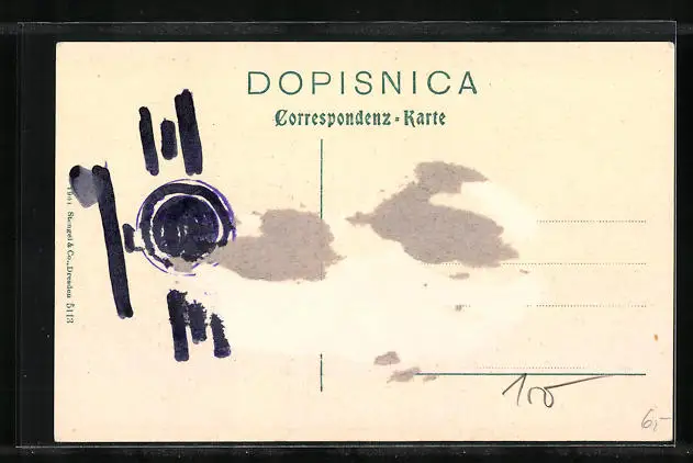 Personenbezogene Daten auf der Rückseite der Karte wurden durch blauen Textmarker unkenntlich gemacht. Die blauen Stellen sind auf die Vorderseite durchgeweicht und wirken sich negativ auf das Postkartenfoto aus