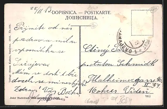 alte Ansichtskarte, gelaufen 1913, Briefmarke entfernt, rückseitig Oberflächenschaden, guter Zustand