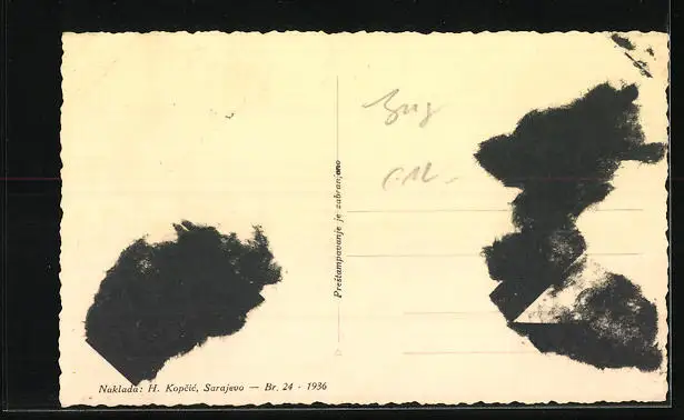 Personenbezogene Daten auf der Rückseite der Karte wurden durch blauen Textmarker unkenntlich gemacht. Die blauen Stellen sind auf die Vorderseite durchgeweicht und wirken sich negativ auf das Postkartenfoto aus