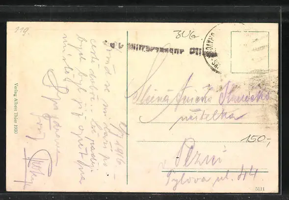 gelaufen 1916, Briefmarke entfernt, leicht fleckig, Eckknick re. unten, guter Zustand