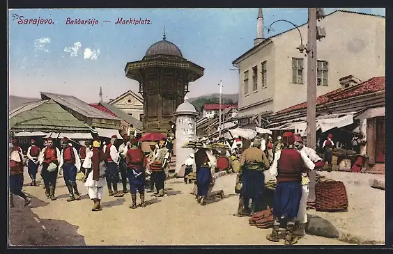 AK Sarajewo, Bascarsija, Marktplatz mit Strassenhändlern