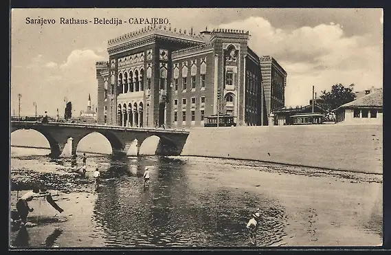 AK Sarajewo, Strassenbahn vor dem Rathaus