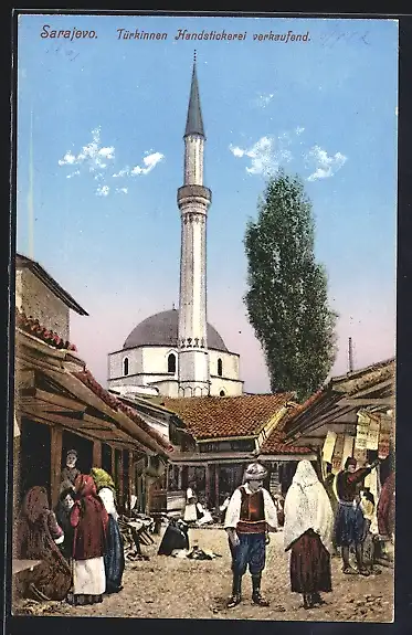 AK Sarajewo, Strassenpartie mit Moschee, Türkin verkauft Handstickerei