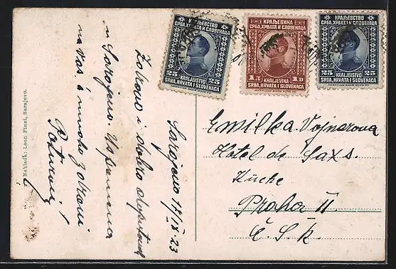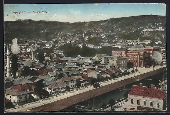 AK Sarajewo, Teilansicht aus der Vogelschau, Strassenbahn